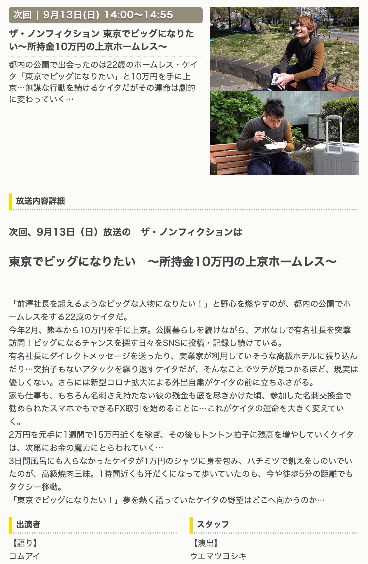 ザ ノンフィクション 9月13日 日 14 00 14 55放送 東京でビッグになりたい 所持金10万円の上京ホームレス 都内の公園で出会ったのは22歳のホームレス ケイタ 東京でビッグになりたい と10万円を手に上京 無謀な行動を続けるがその運命は劇的